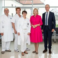 Foto © Ordensklinikum Linz: v.l.: OA Dr. Bernhard Reiter (Leiter der Palliativstation am Ordensklinikum Linz Elisabethinen), DGKP Anita Honeder (stv. Stationsleiterin am Ordensklinikum Linz Elisabethinen), Dr.in Isabelle Allmendinger (Ordensfrau und Palliativmedizinerin am Ordensklinikum Linz Barmherzige Schwestern), LH-Stv.in Gesundheitslandesrätin Mag.a Christine Haberlander und Dr. Stefan Meusburger (Geschäftsführer Ordensklinikum Linz)